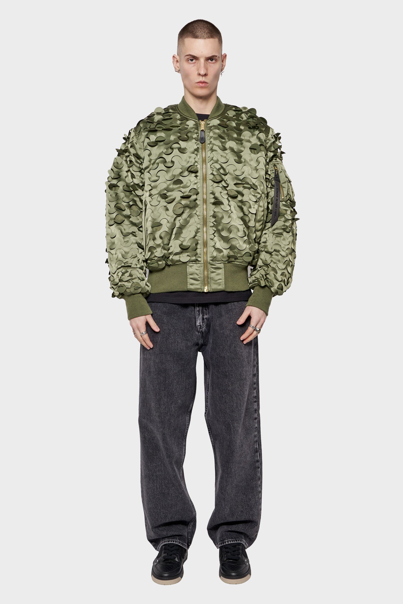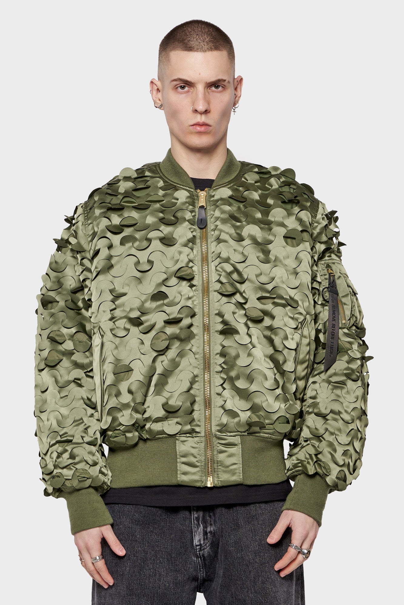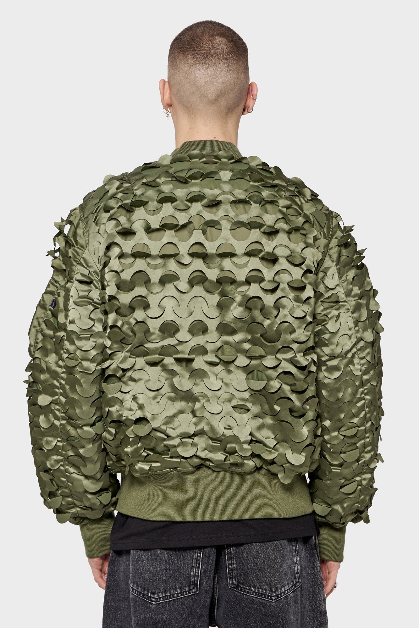 • Green bomber jacket with all-over laser pattern