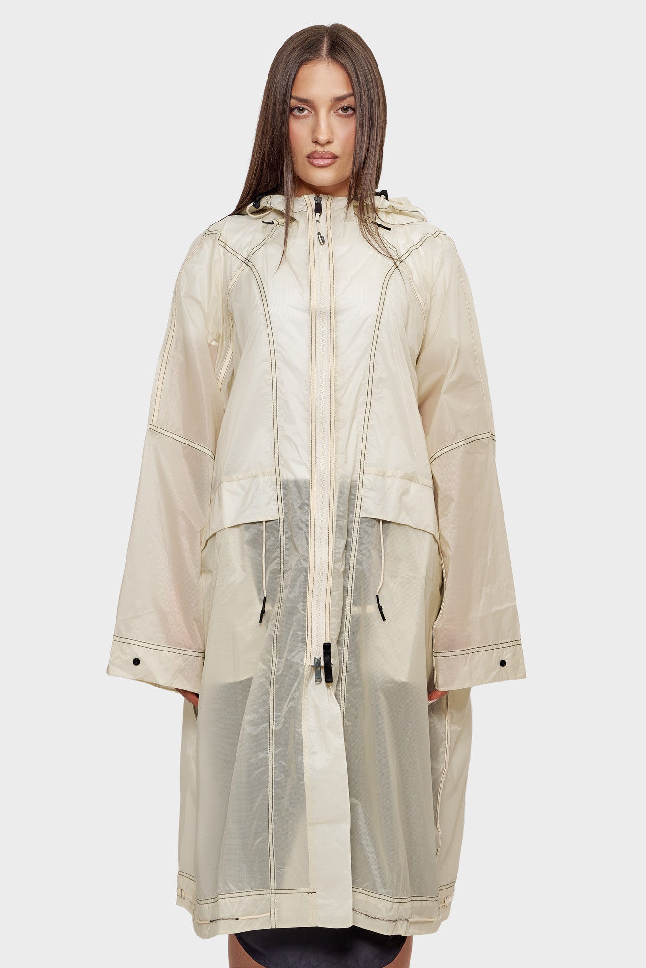 - Hood with drawstring adjustment for wind and rain protection