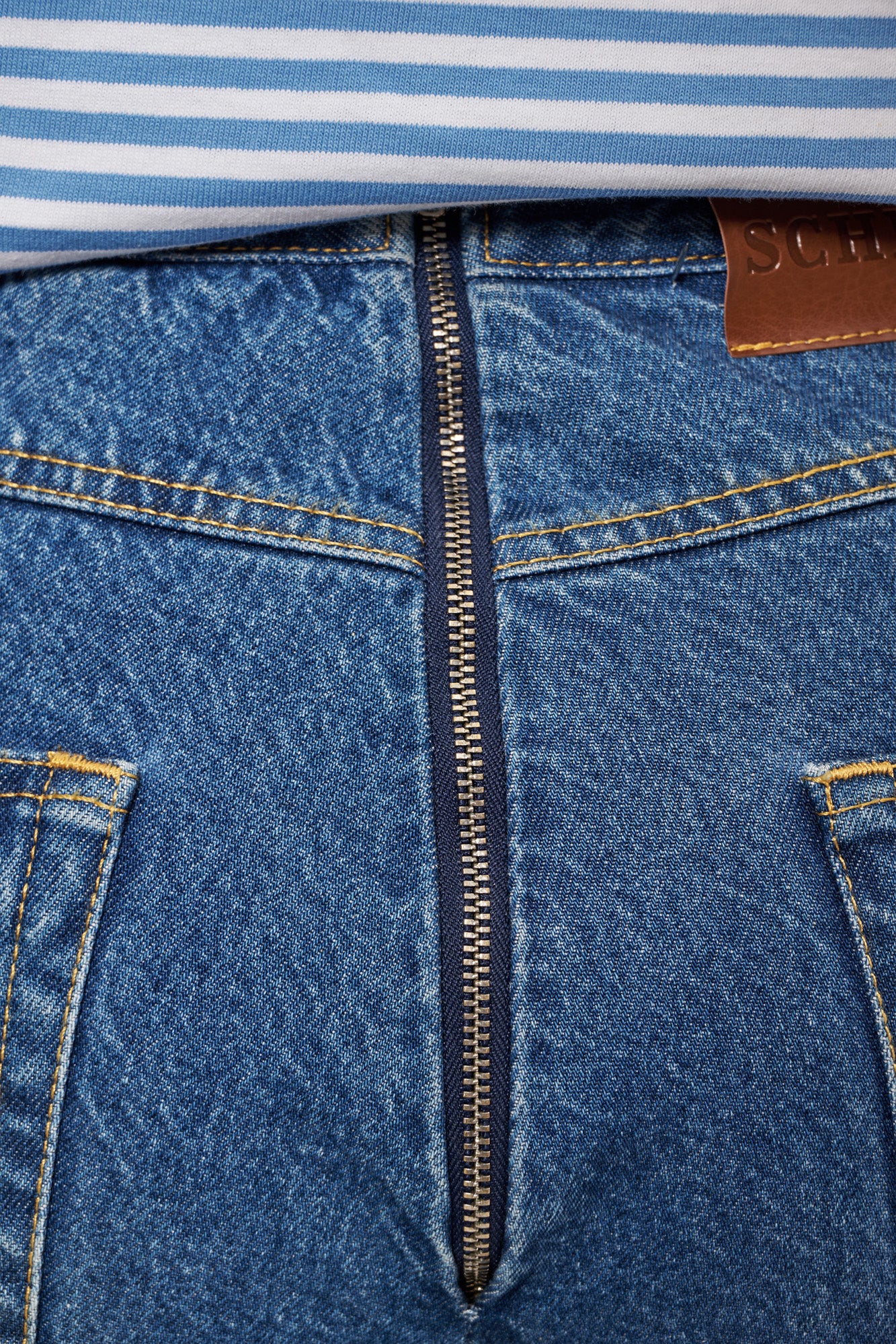 - Blue jeans with a faux skirt on top